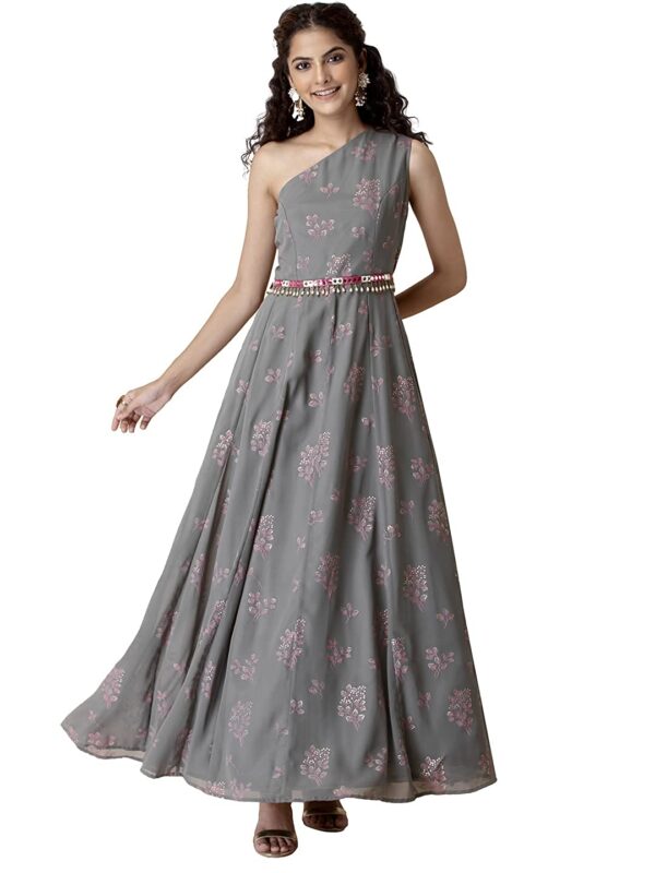 Indya Women’s Grey Kurta Foil One Shoulder Belted Maxi
