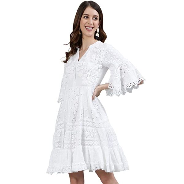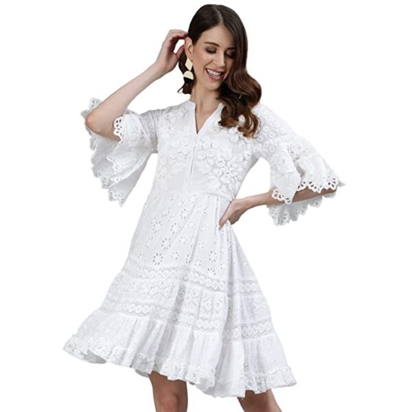 Cotton White Schiffli Embroidered A-Line Dress Suitable For All Season Comfortable To Wear & Beautiful In Look, It Has Bell Sleeves & Mandarin Collar