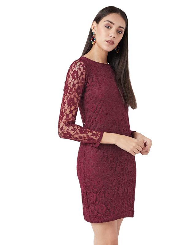 Miss Chase Women’s Maroon Round Neck Full Sleeves Lace Bodycon Mini Dress