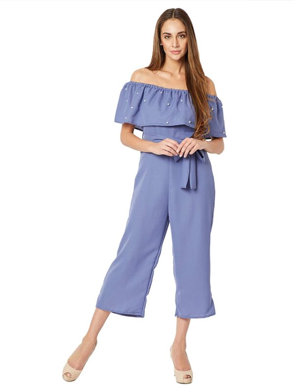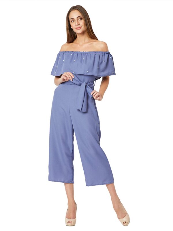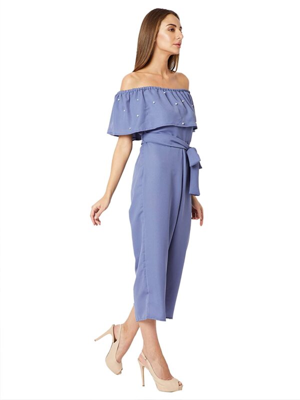 This solid pearl detailing belted midi Bardot style Off-shoulder jumpsuit, Is sleeves and has a zip closure