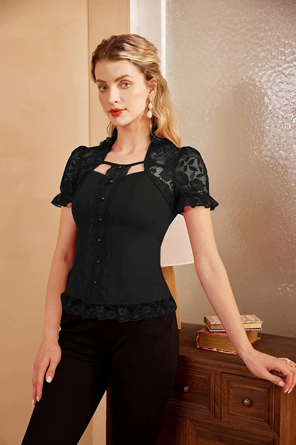 Women Victorian Short Lace Sleeve Vintage Button Down Blouse