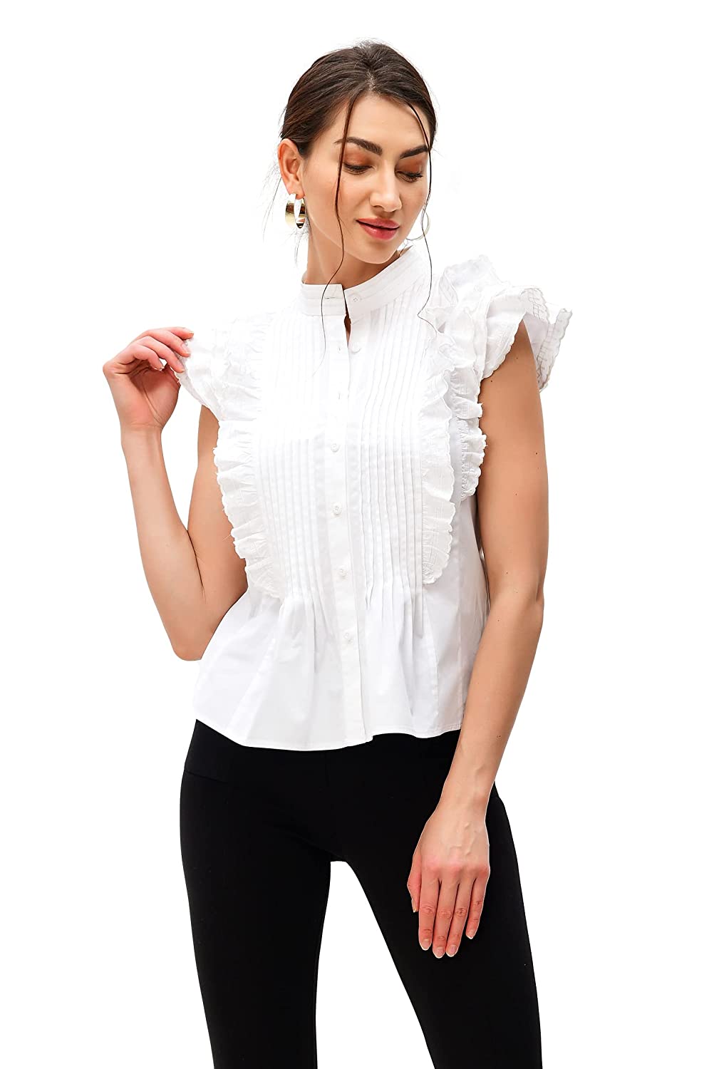 Banded collar. , Ruffle cap sleeves, scallop trim. , Above the hip length. , Front self-button closure. , Inner shoulder bra strap keeps. , 98% cotton/2% spandex, woven poplin, pre-shrunk, smooth finish, wrinkle-resistant, light stretch, midweight. , Machine wash cold. , Model is wearing our size S/4, cut for her height of 5’10”.