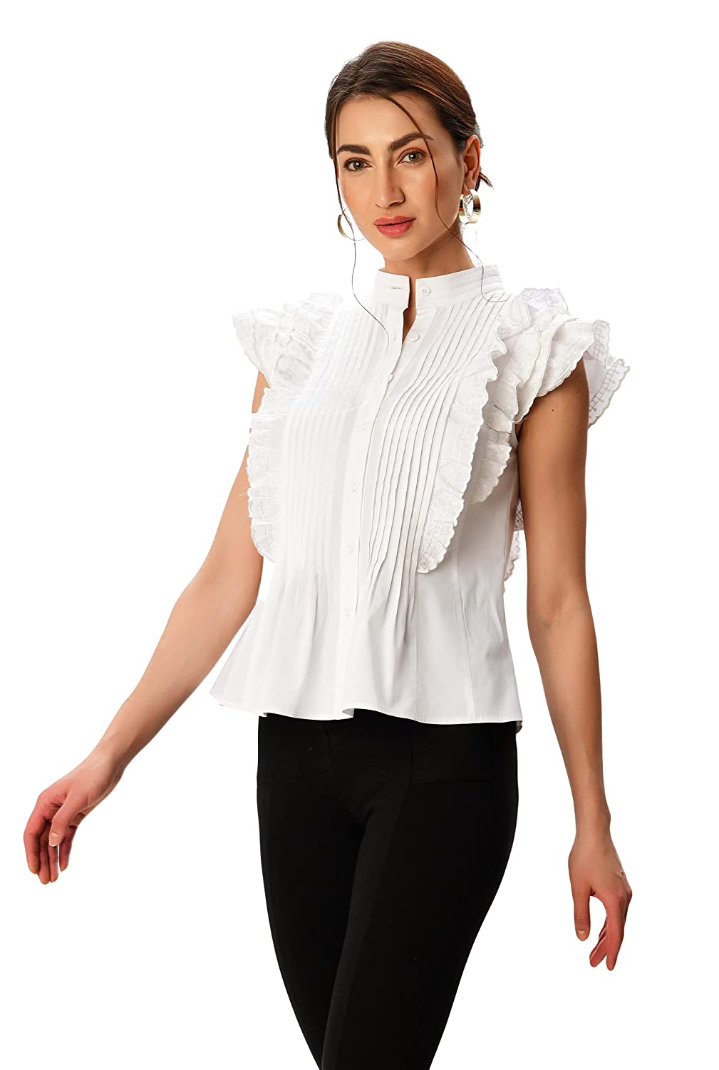 Zapelle Custom Clothing | Women’s Embroidery Ruffle Pintuck Pleat Cotton Poplin Blouse | White