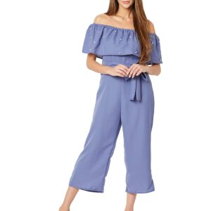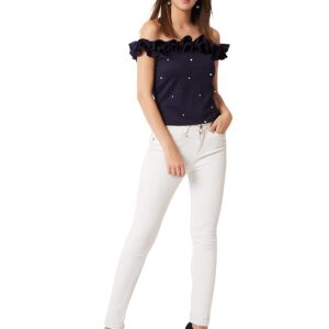 Miss Chase Women’s Navy Blue Off-Shoulder Pearl Ruffled Top